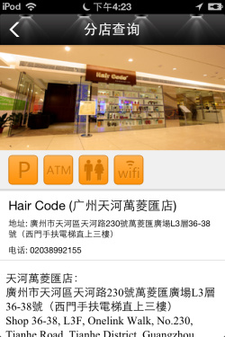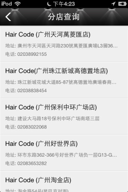 通过该功能,可以看到芭曲发廊每个分店的信息