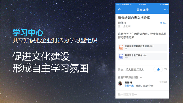 通过这款APP中的分享销售技巧、服务心得、行业动态、竞品信息、好文好书、共同进步!共享知识把企业打造为学习型组织,促进文化建设形成自主学习氛围 。
